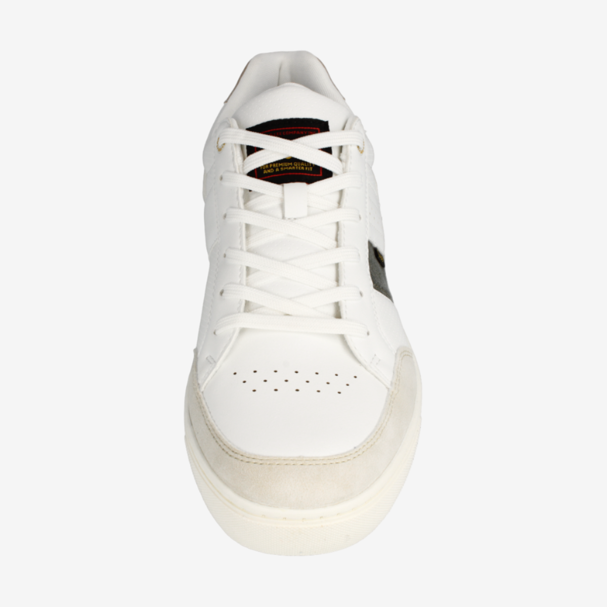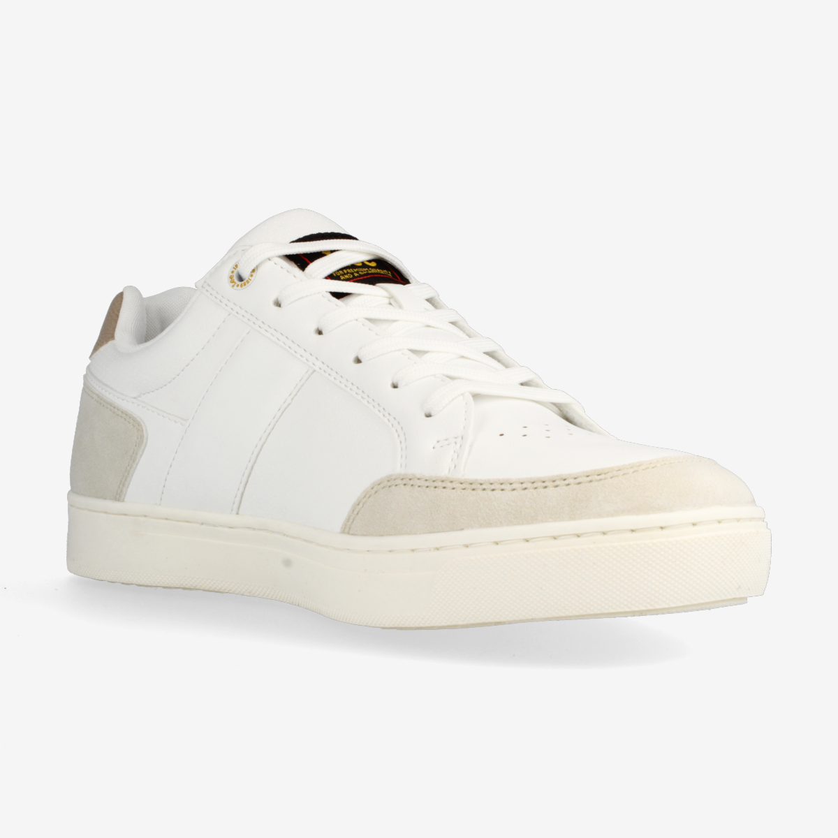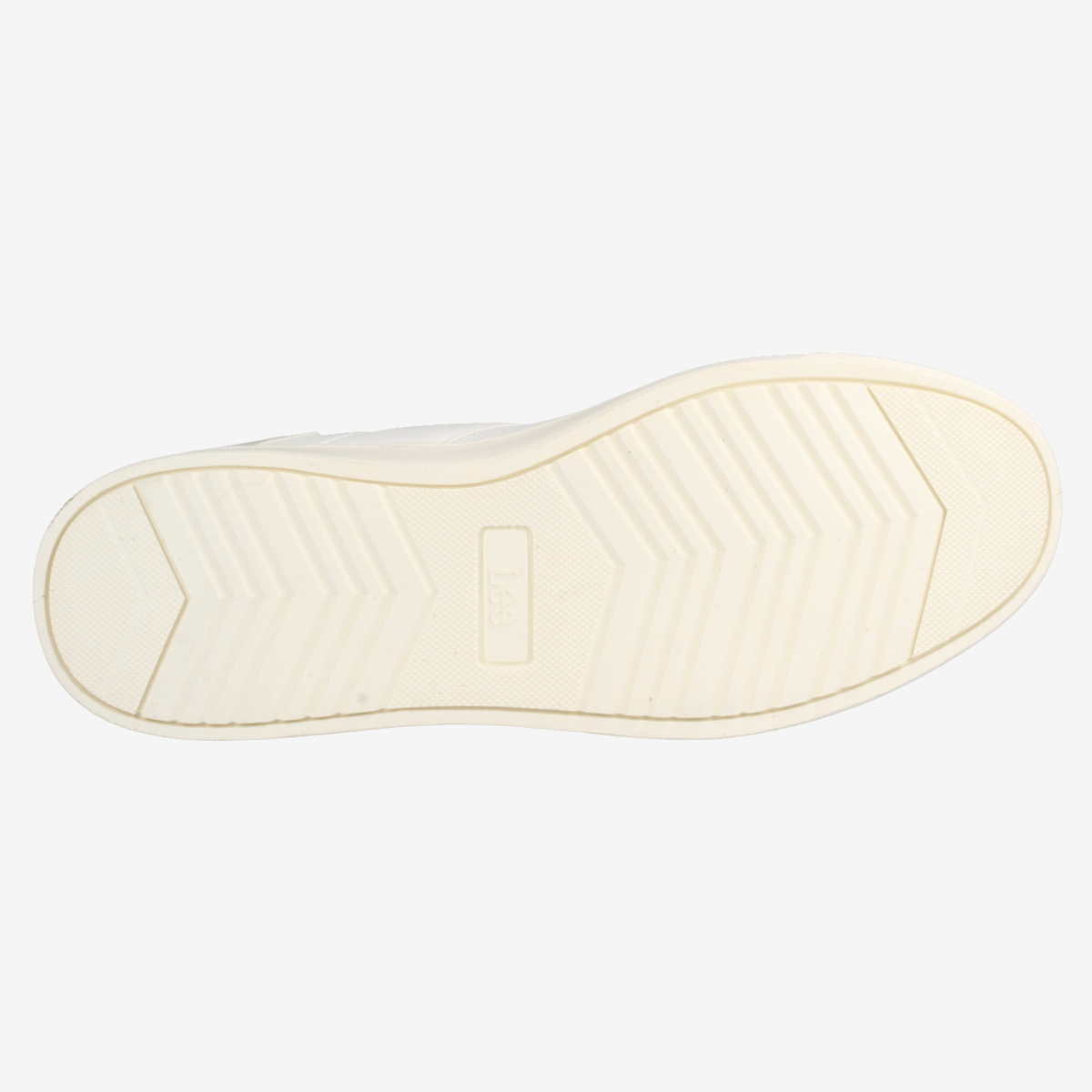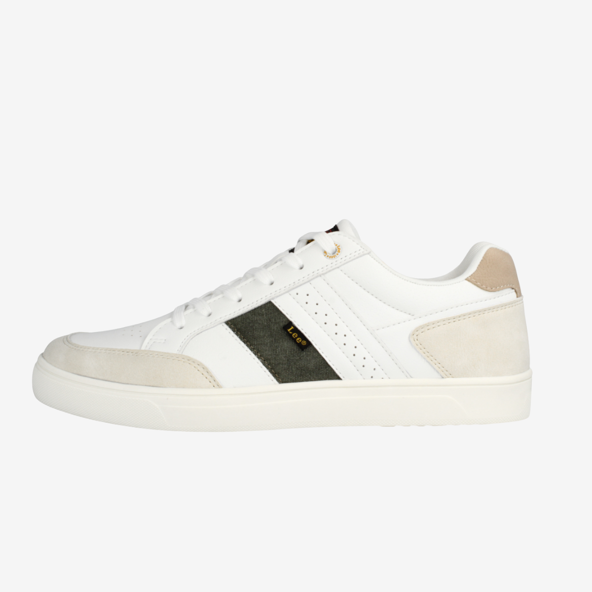 Discover the Lee Dean Men Low. Bright white sneakers with suede-look fabric overlays, dark stripe detail, and cushioned comfort for versatile everyday style.