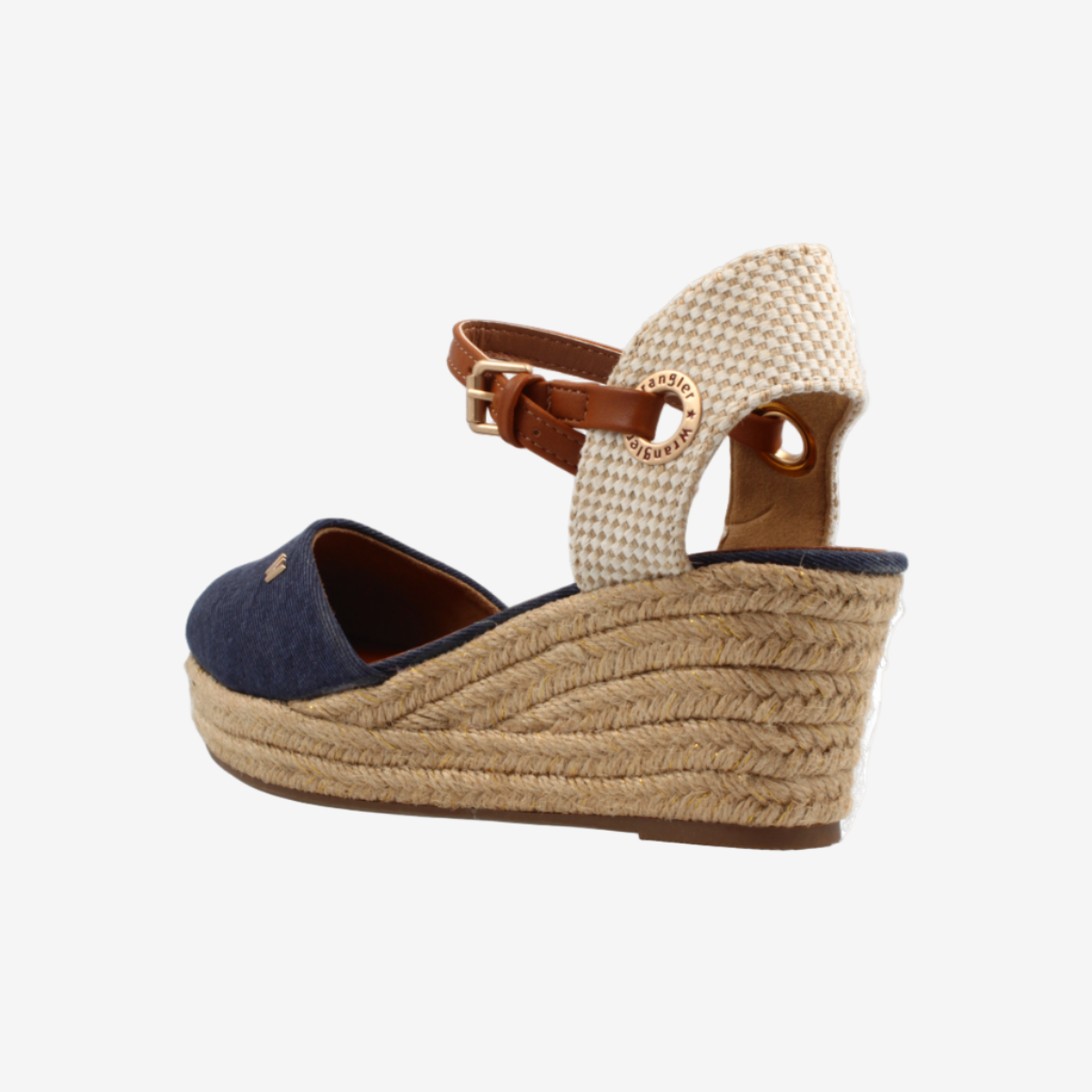 Wrangler Bela C Women Semi Wedge. Dark Denim. Classic denim-inspired wedge sandal with jute sole and ankle strap, perfect for casual summer looks.