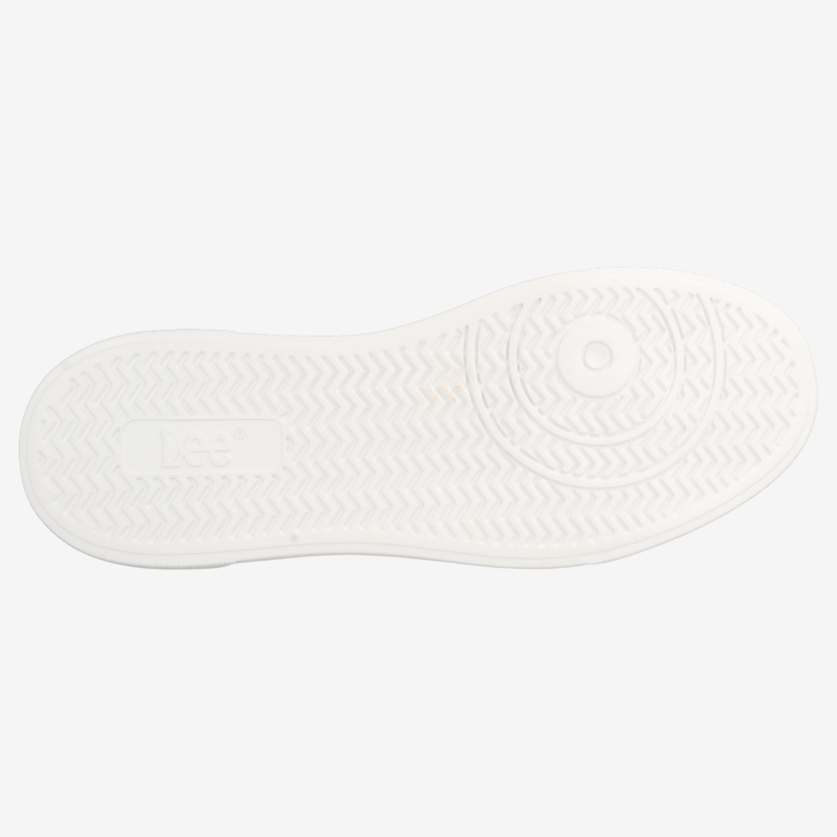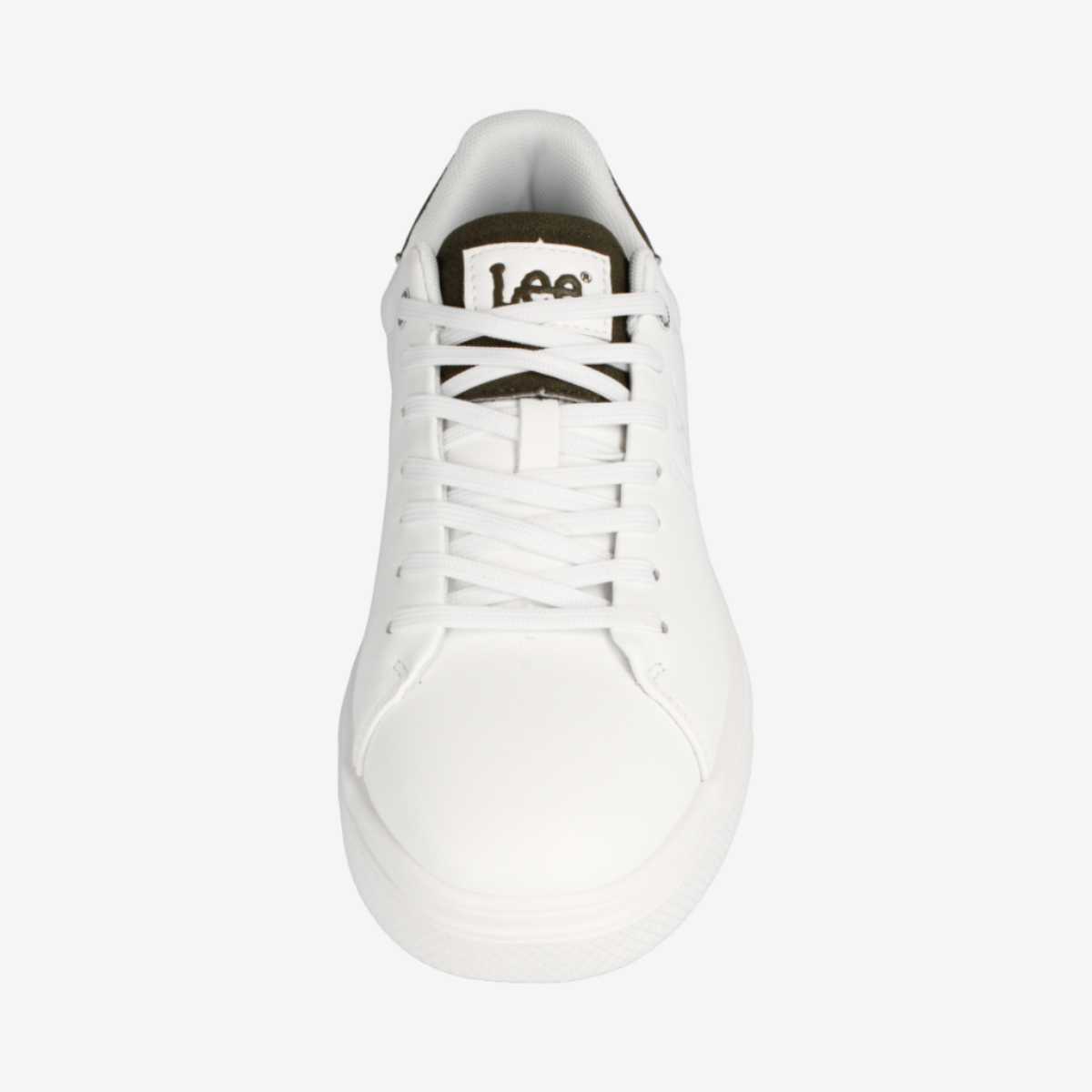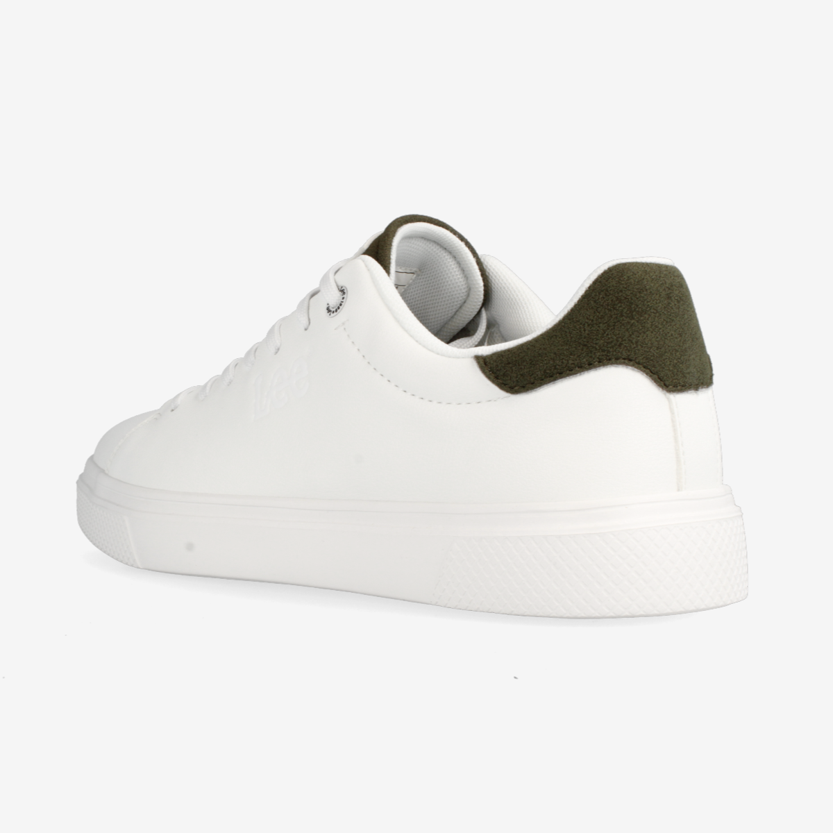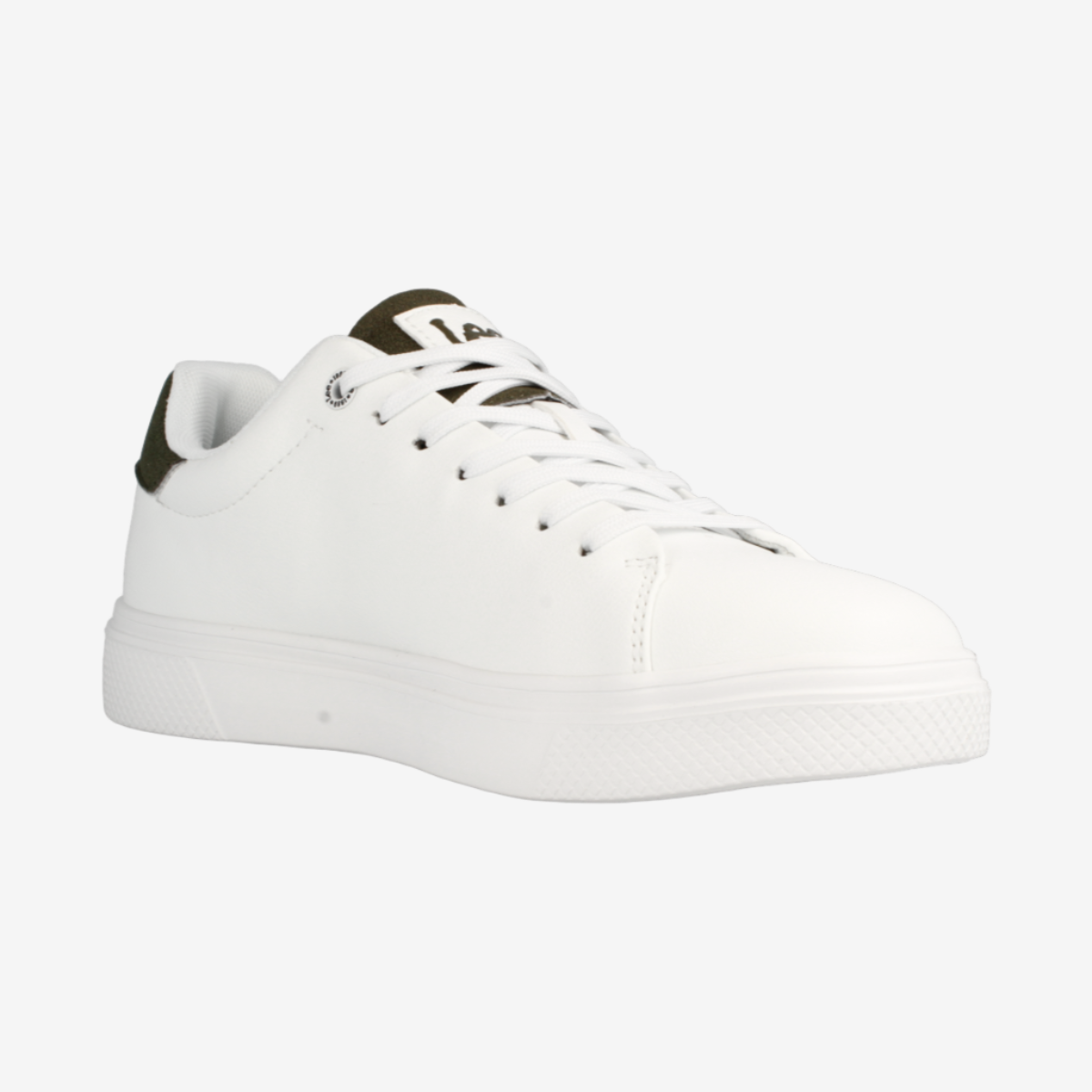 Discover the Lee Brett Men Low. Bright white sneakers with dark green heel detail, cushioned comfort, and a clean, versatile design.